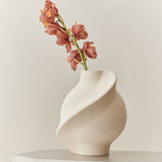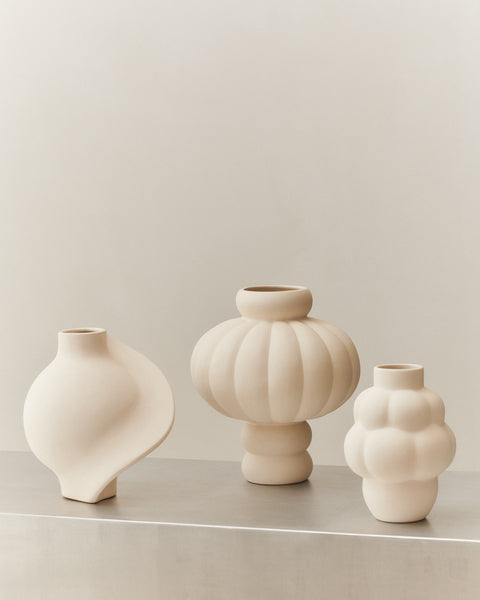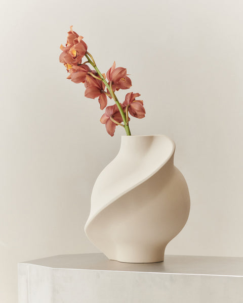 Louise Roe Pirout Vase 02 imponerer med sine myke linjer og elegante proporsjoner – et skulpturelt designobjekt som fanger oppmerksomheten både alene og med blomster. Den flytende silhuetten formidler en følelse av bevegelse, ro og raffinement.
