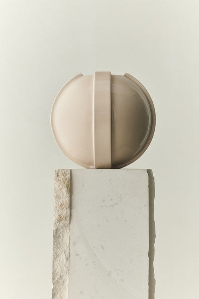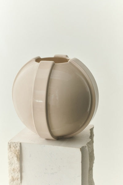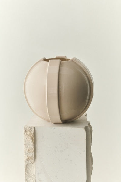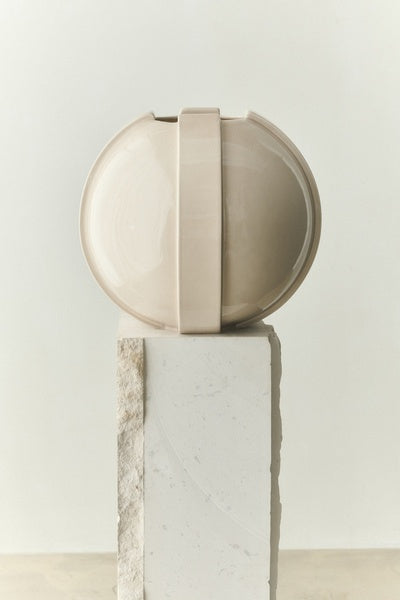 Louise Roe Vinci Vase 01 har en rund, harmonisk silhuett, markert av et belte-lignende bånd som omslutter formen – et subtilt designelement som symboliserer sirkulær energi og balanse.