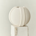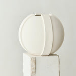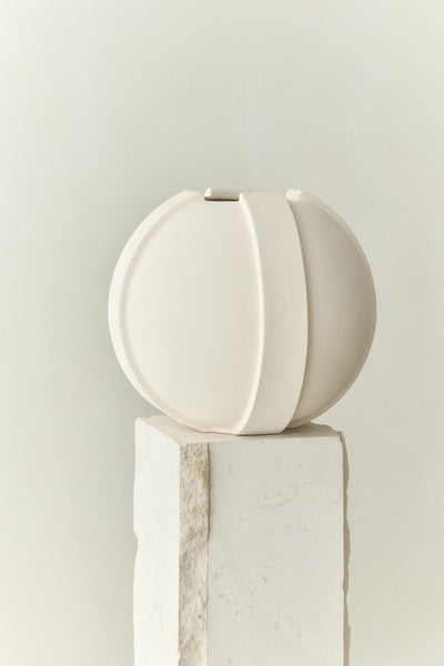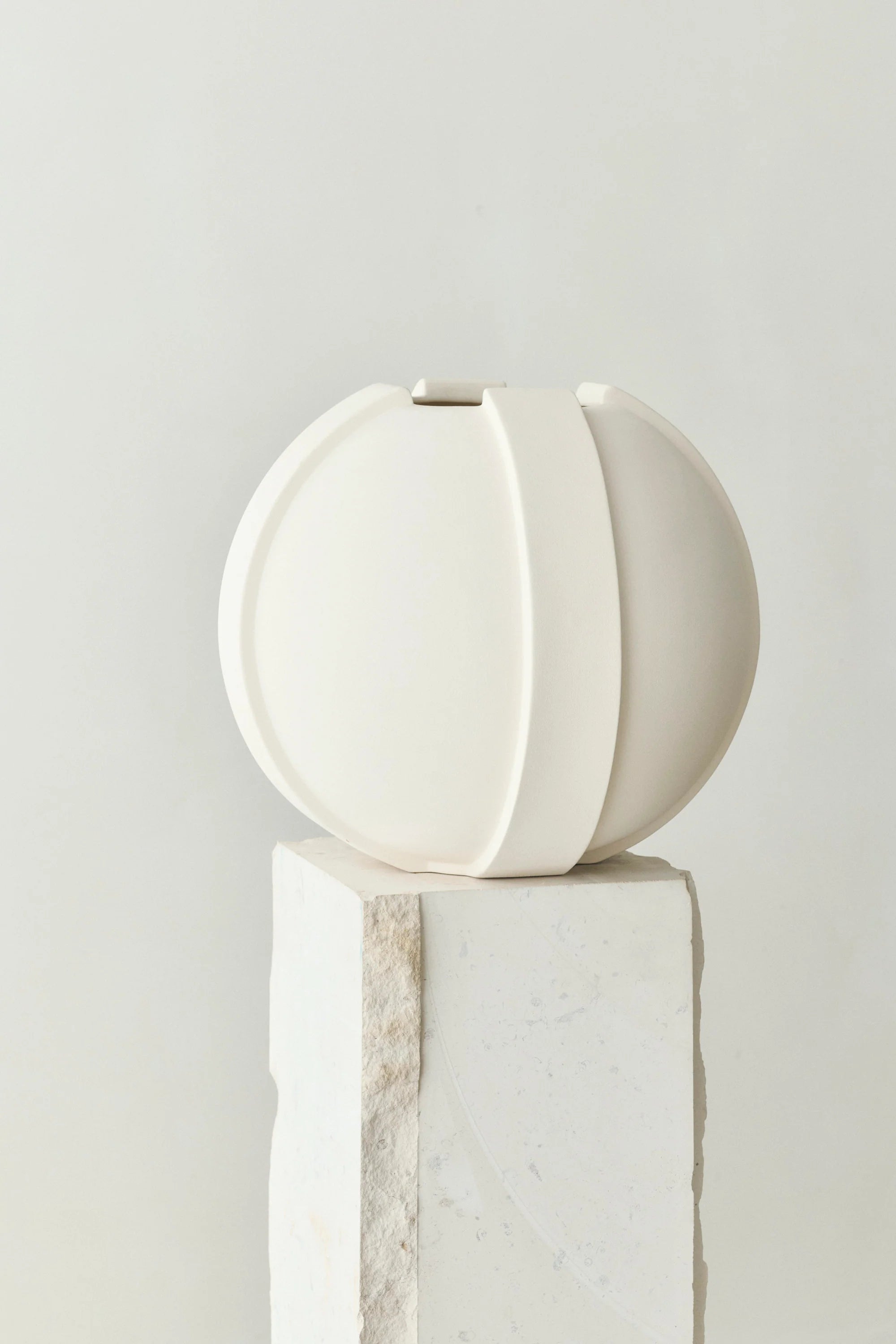 Louise Roe Vinci Vase 02 er en skulpturell og kraftfull statement-vase med en rund, balansert silhuett. Et karakteristisk bånd omslutter formen – et visuelt symbol på sirkulær energi, bevegelse og rytme.