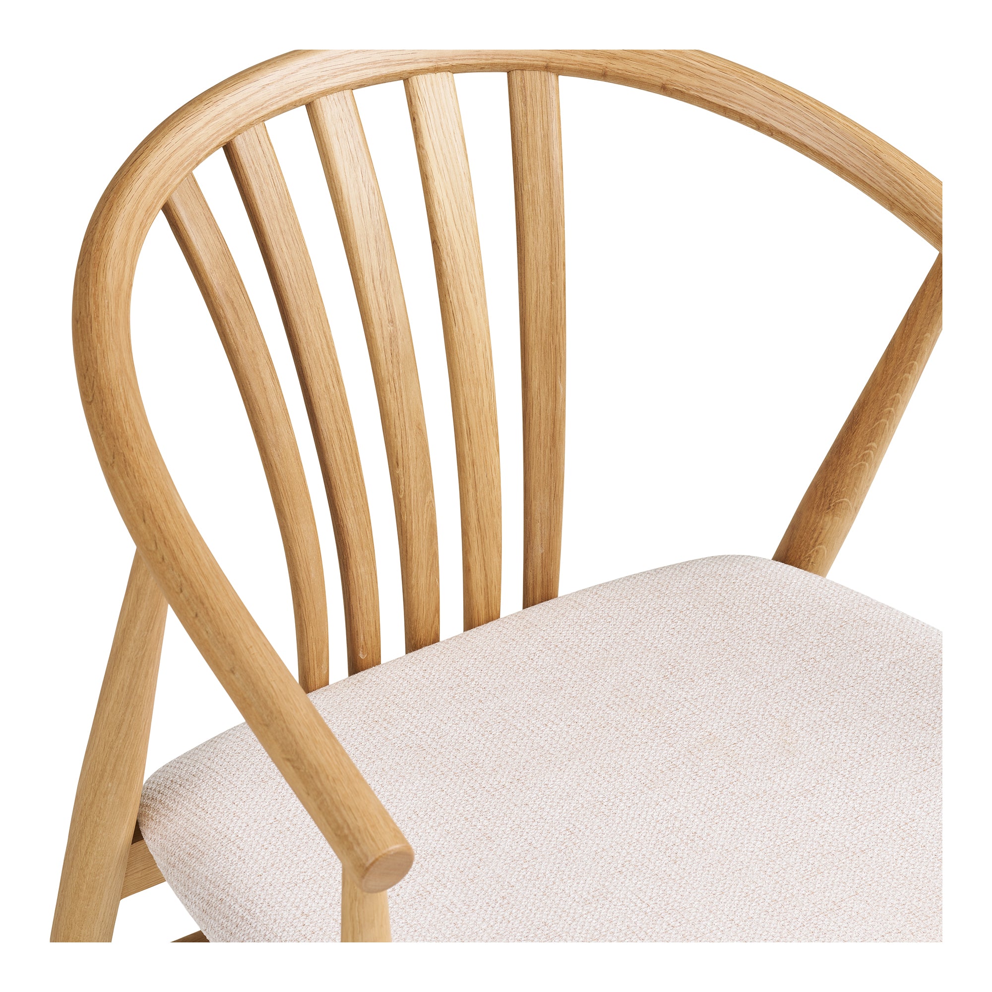 Den avrundede silhuetten og den polstrede sitteflaten gir en komfortabel og innbydende sittestilling, mens det håndverksmessige uttrykket i eik tilfører rommet en lun og eksklusiv følelse.