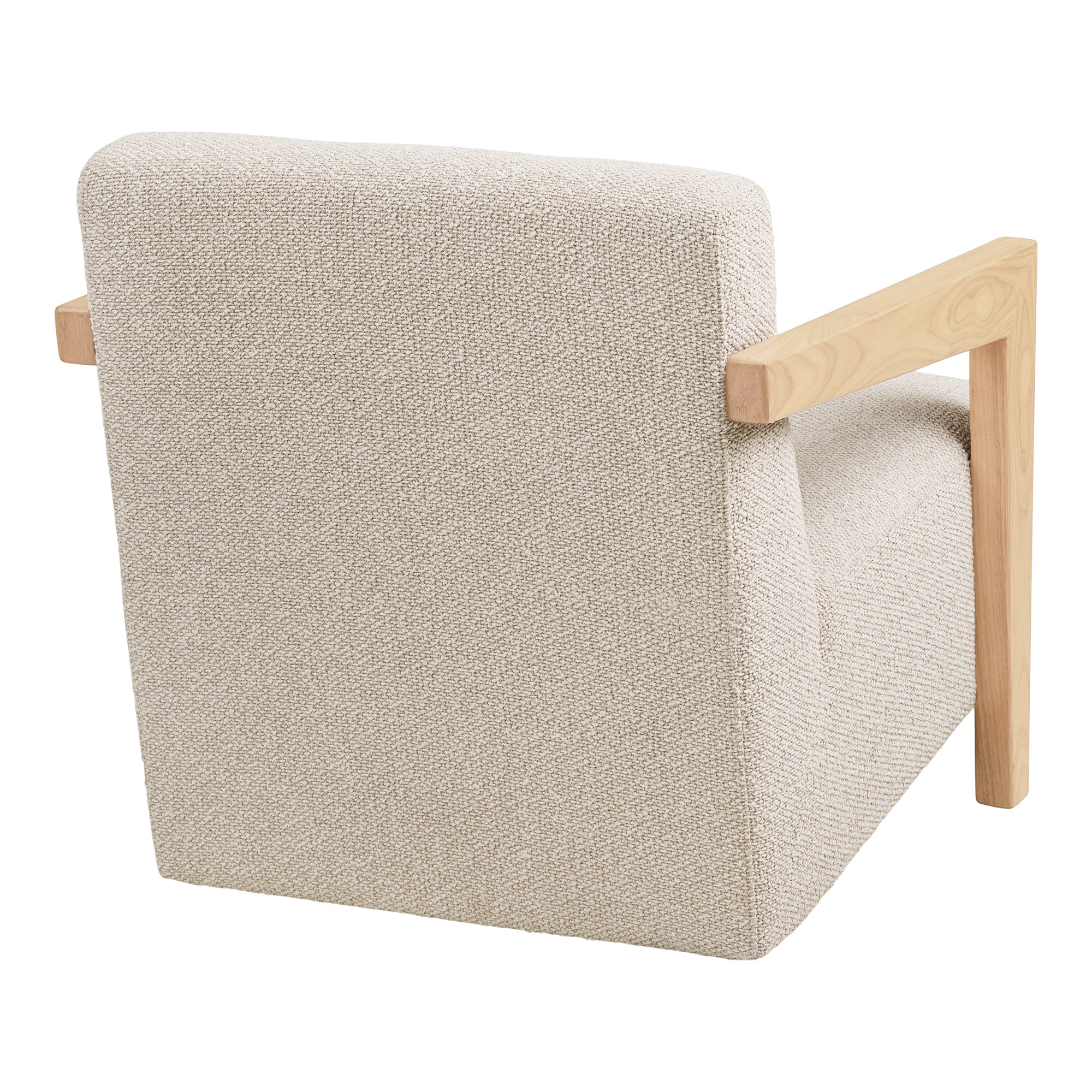 Med sitt lune beige trekk og solide ben i eik, kombinerer stolen moderne komfort med naturlig varme. Den generøse sitteflaten og den lave profilen inviterer deg til å lene deg tilbake, mens den myke polyuretanskummen med høy tetthet (36 kg/m³) gir fantastisk støtte og varig komfort.