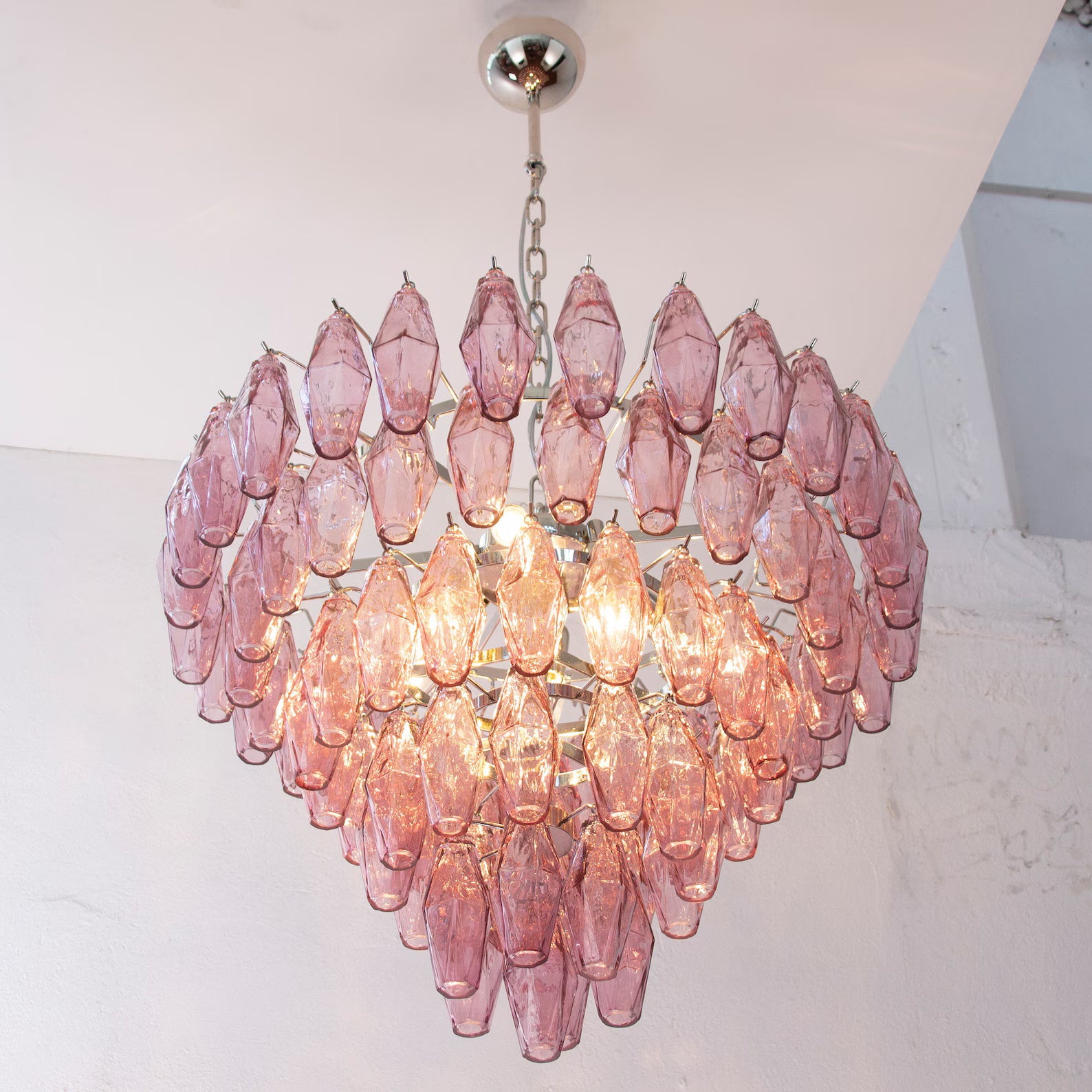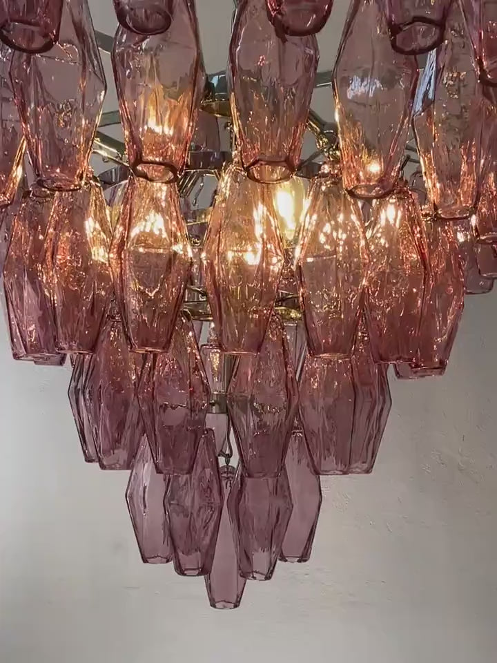 Et ekte ikon fra italiensk designhistorie – Poliedri 75 Chandelier kombinerer klassisk Venini-estetikk med moderne mid-century uttrykk. De håndblåste, geometriske glassene i Amethyst gir en lun og sofistikert glød, og fremhever det unike lysspillet som kjennetegner ekte Murano-håndverk.