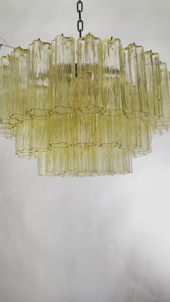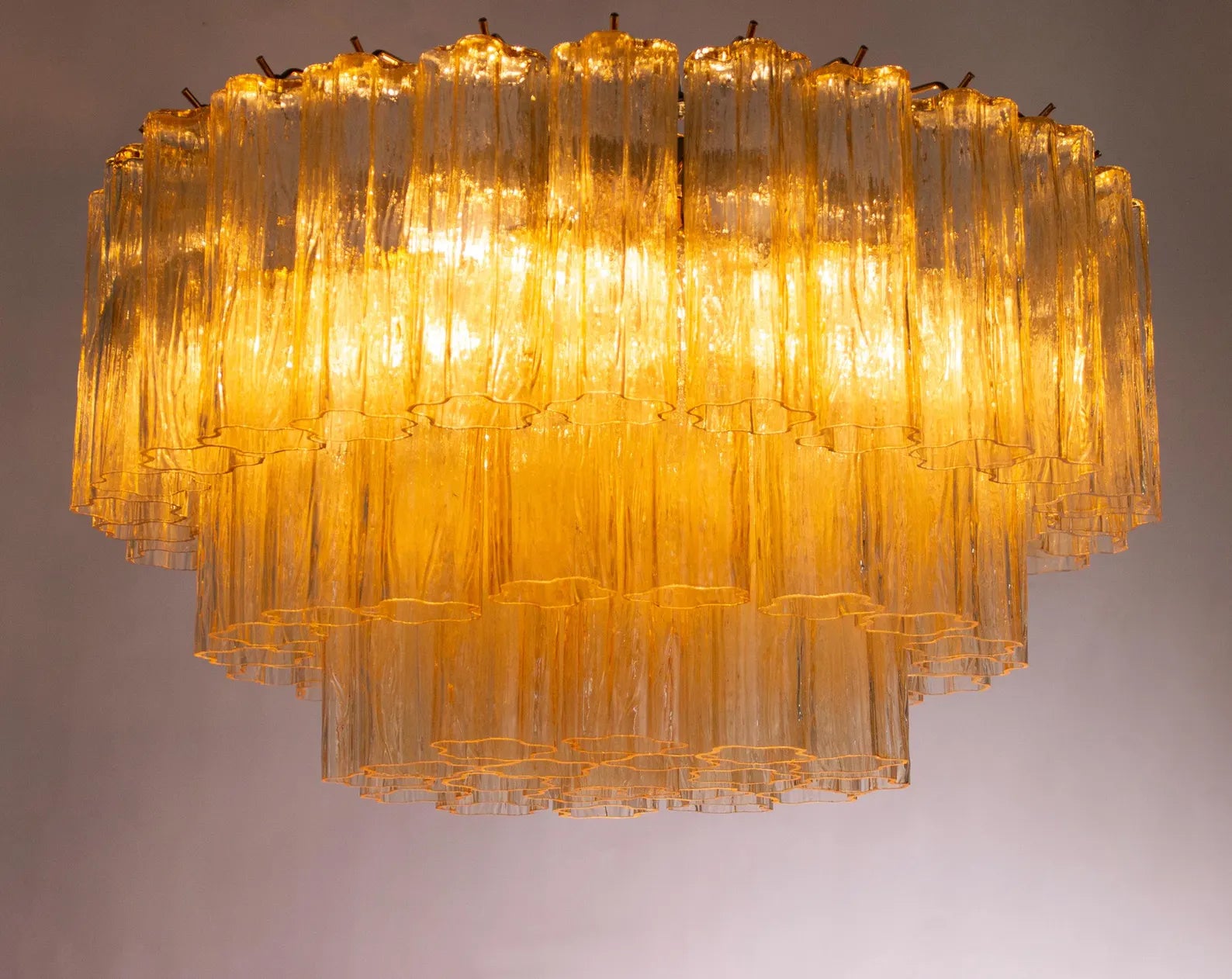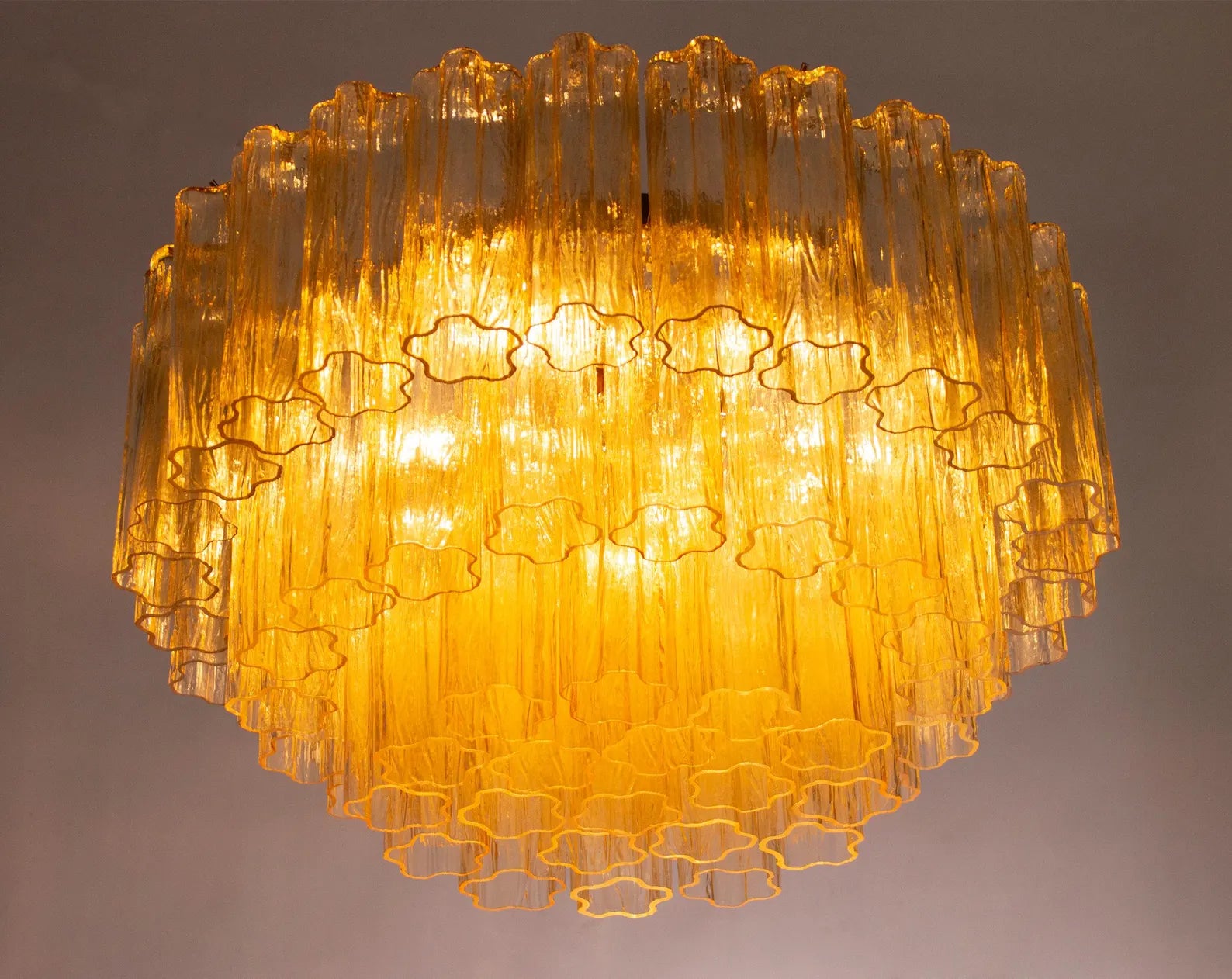 Murano Champagne Tronchi Flush Chandelier er en eksklusiv italiensk taklampe håndlaget i Murano-glass. De 63 munnblåste Tronchi-rørene i elegant champagnefarge sprer et varmt og luksuriøst lys – et tidløst statement av italiensk design.