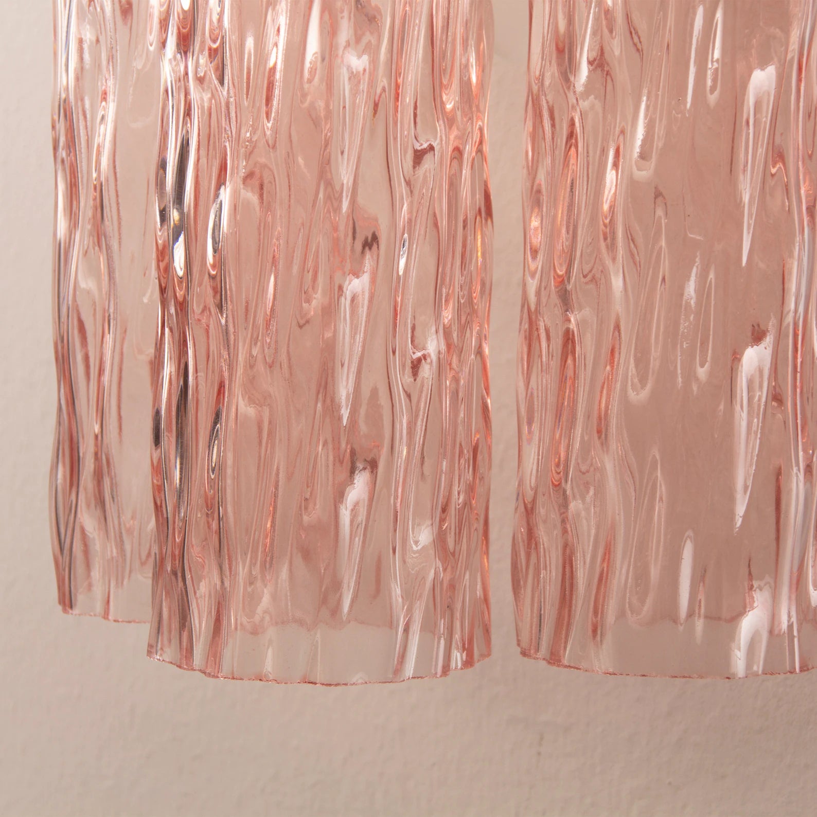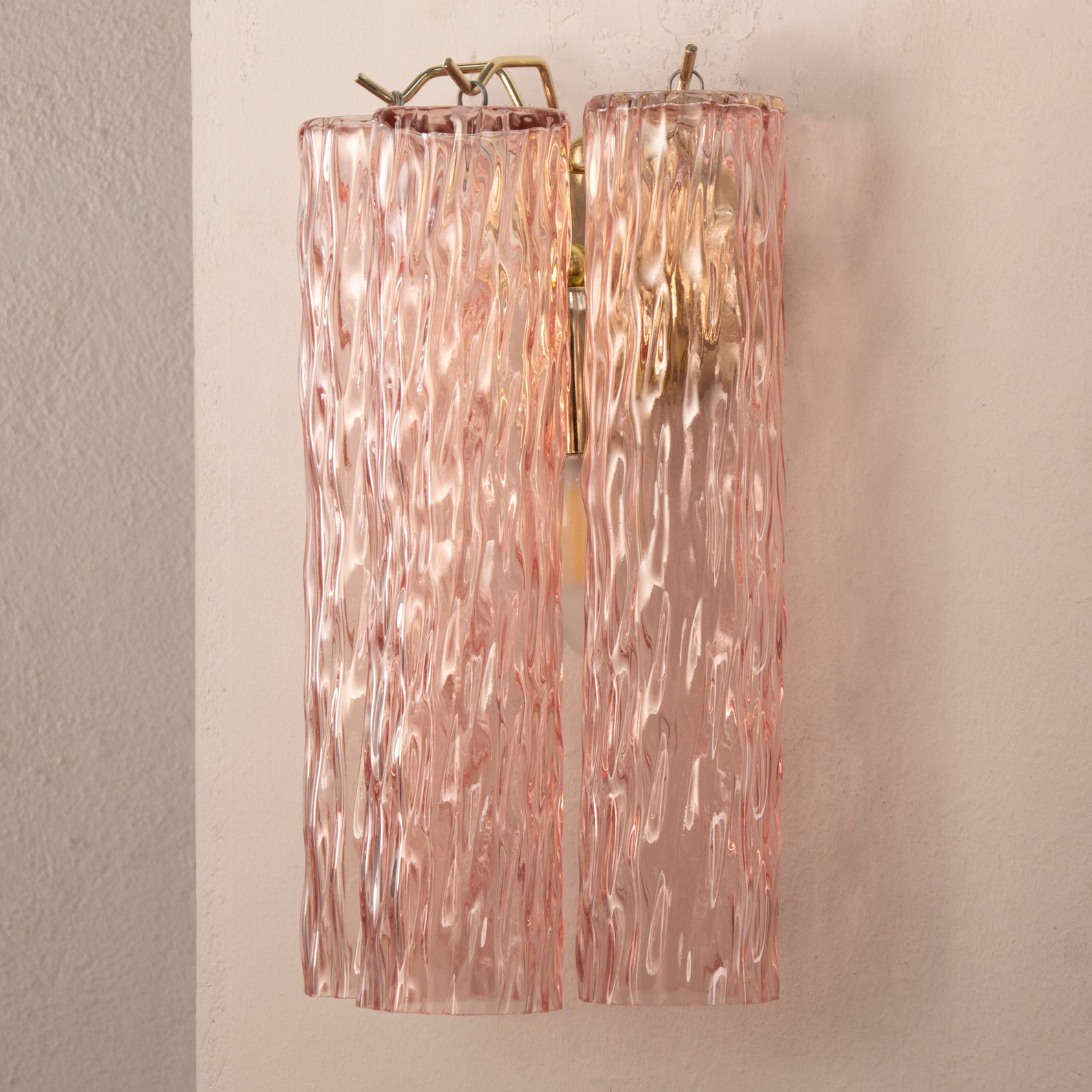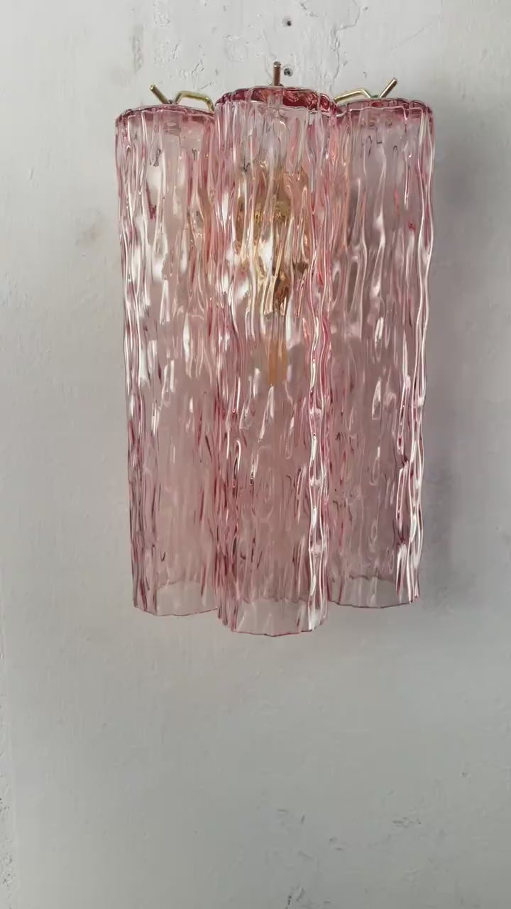 Murano Pink Tubes Wall Sconces er et elegant par håndlagde vegglamper i munnblåst Murano-glass. De tre strukturerte glassrørene i rosa farge gir et friskt og luksuriøst uttrykk – et perfekt blikkfang som tilfører varme og karakter til enhver vegg.