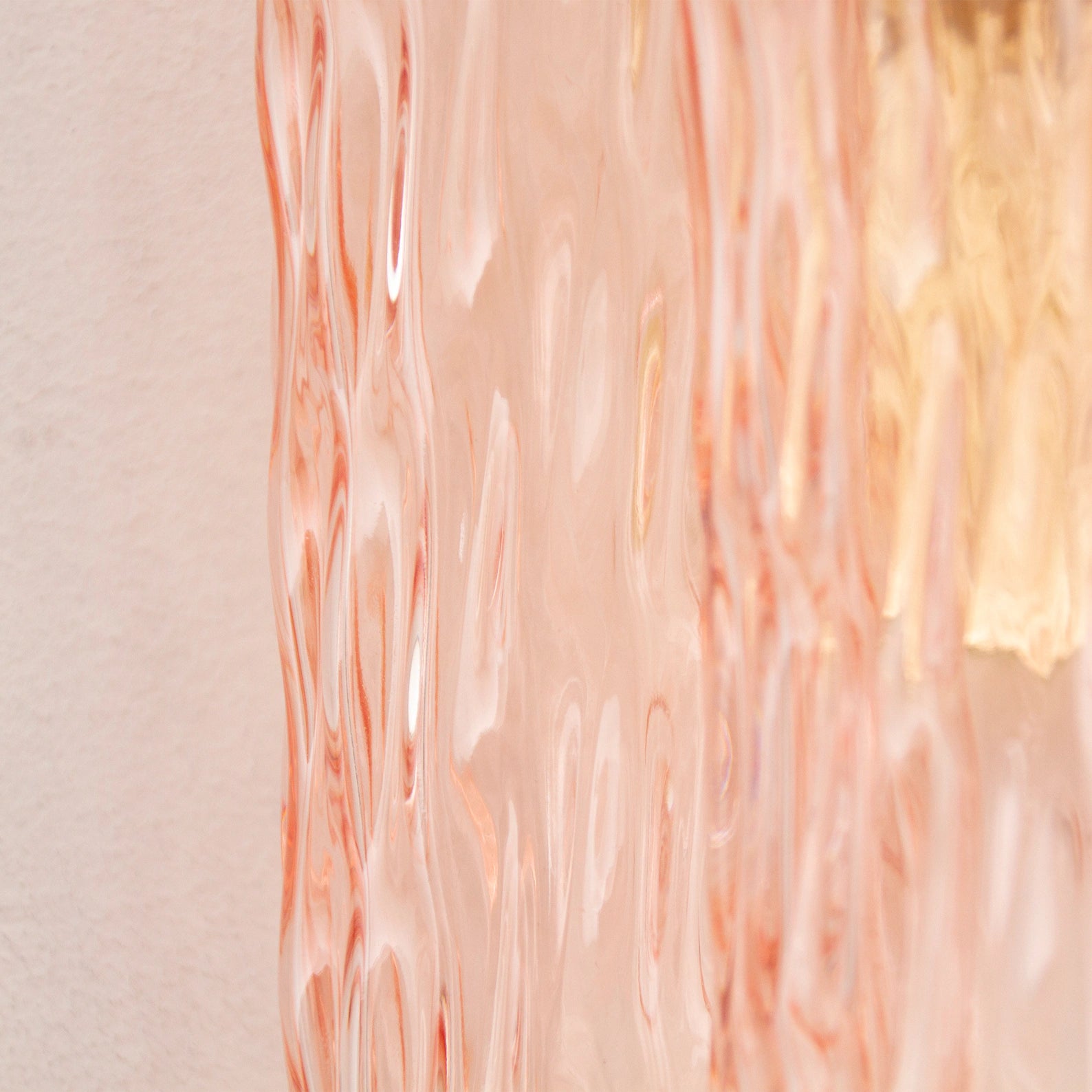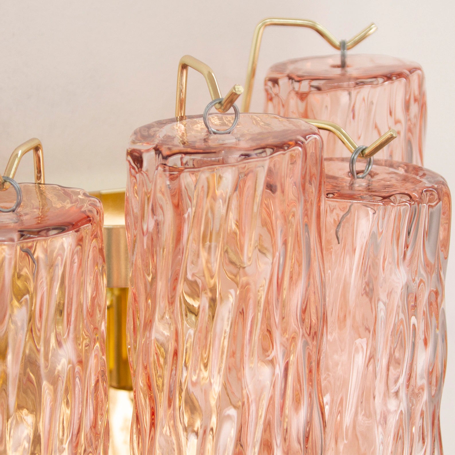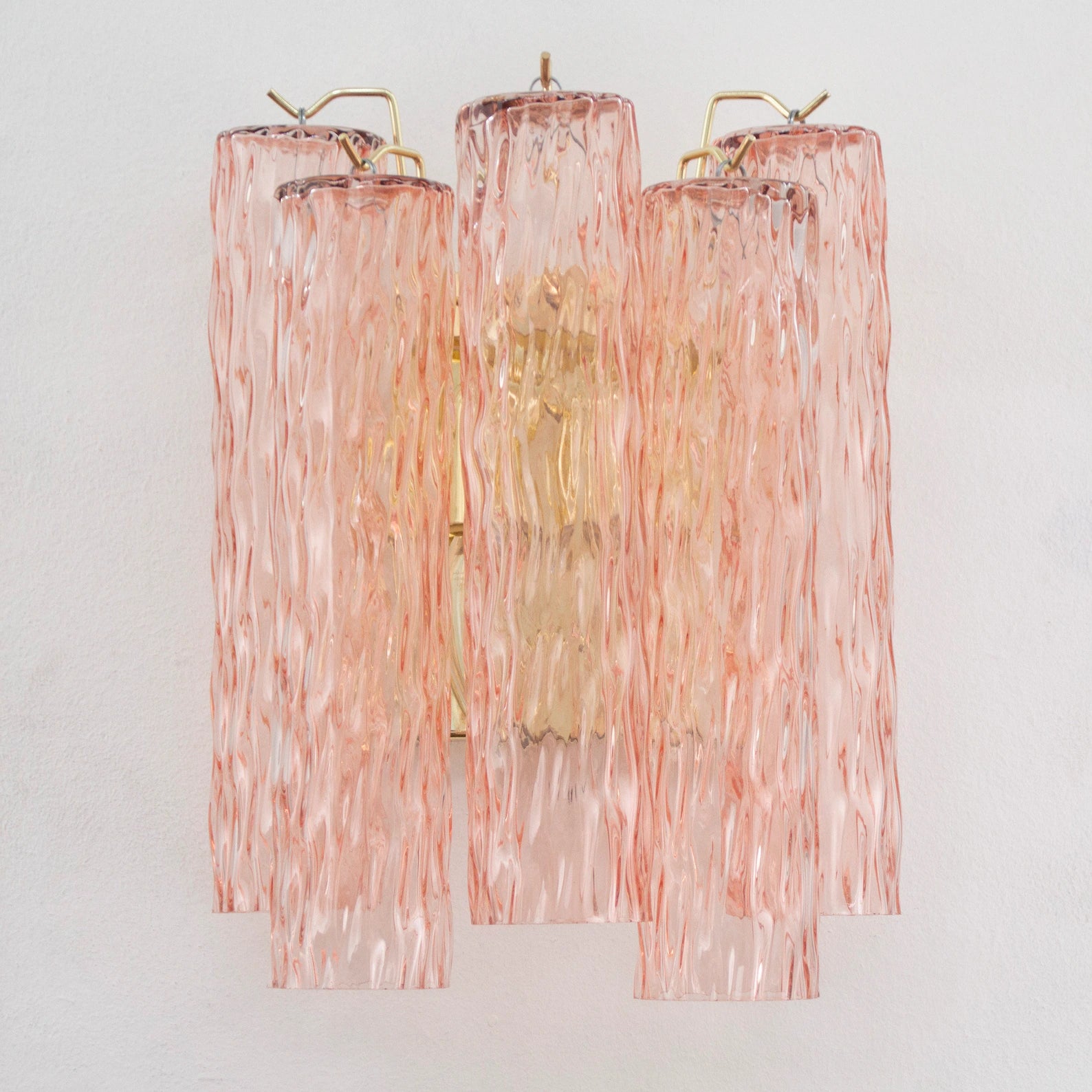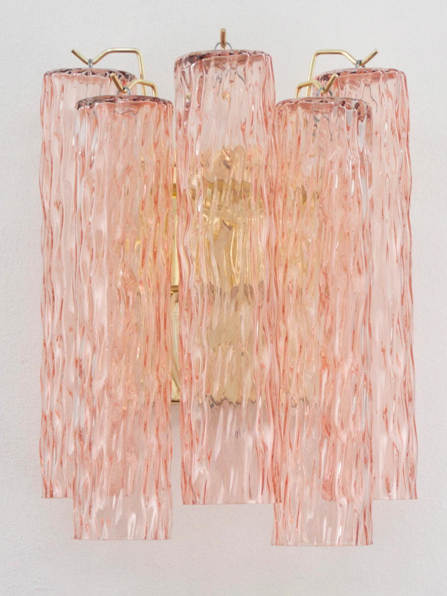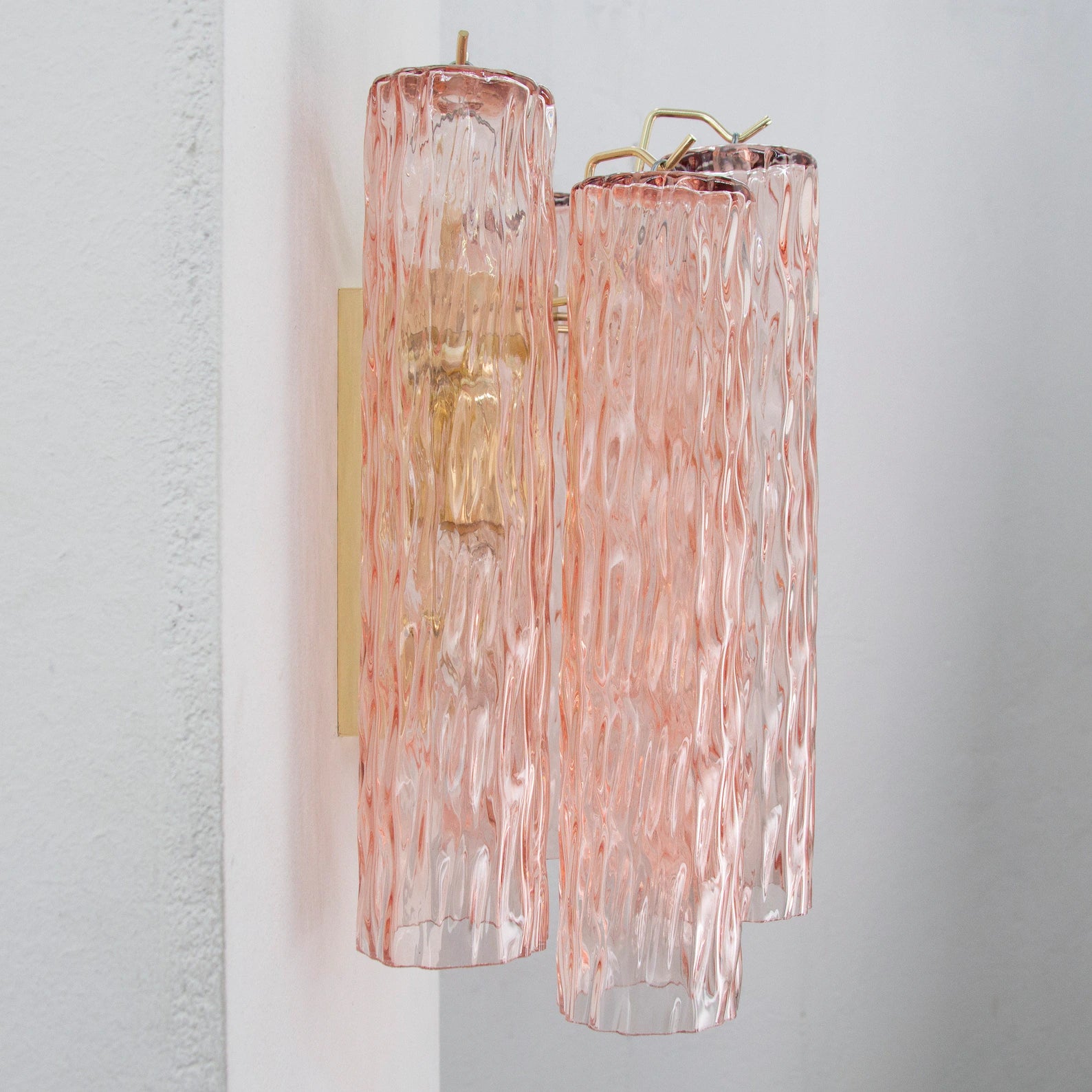 Murano Pink Tubi Wall Sconces er et vakkert par håndlagde vegglamper i dekorert rosa Murano-glass. De sylindriske Tubi-elementene skaper et varmt, luksuriøst lys og tilfører rommet et delikat vintagepreg med moderne eleganse.
