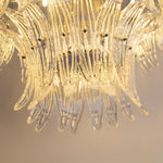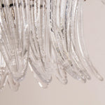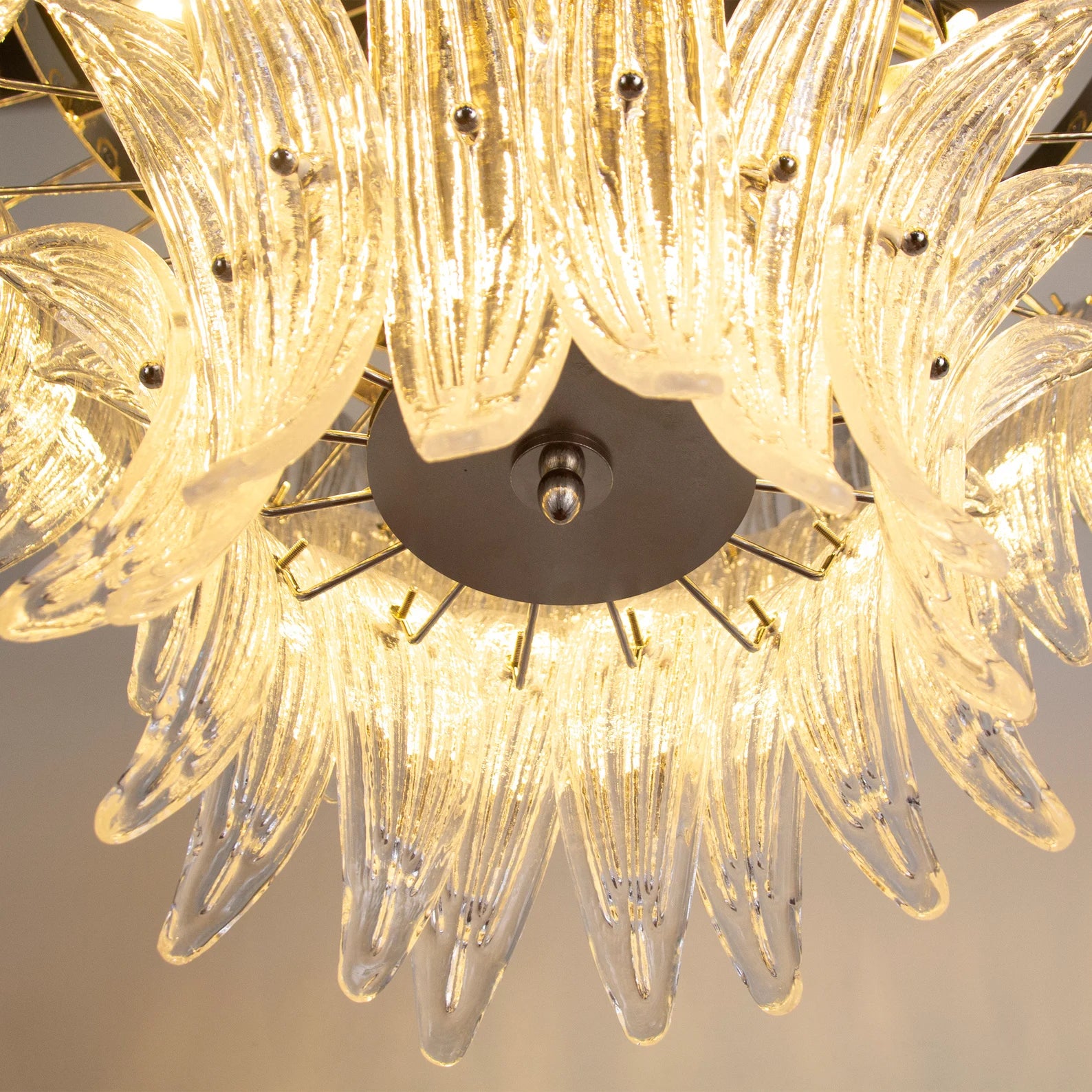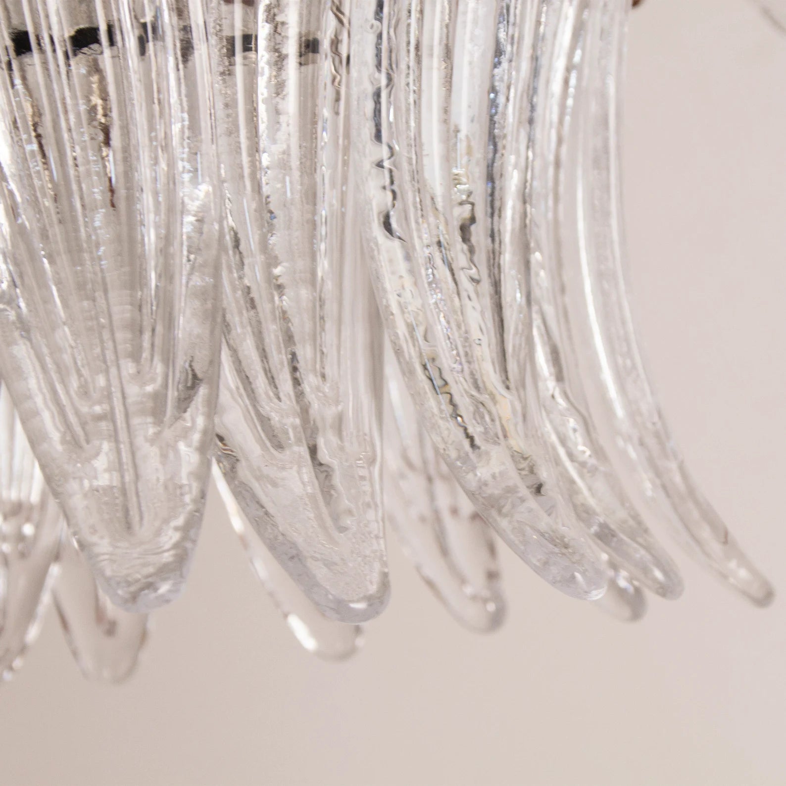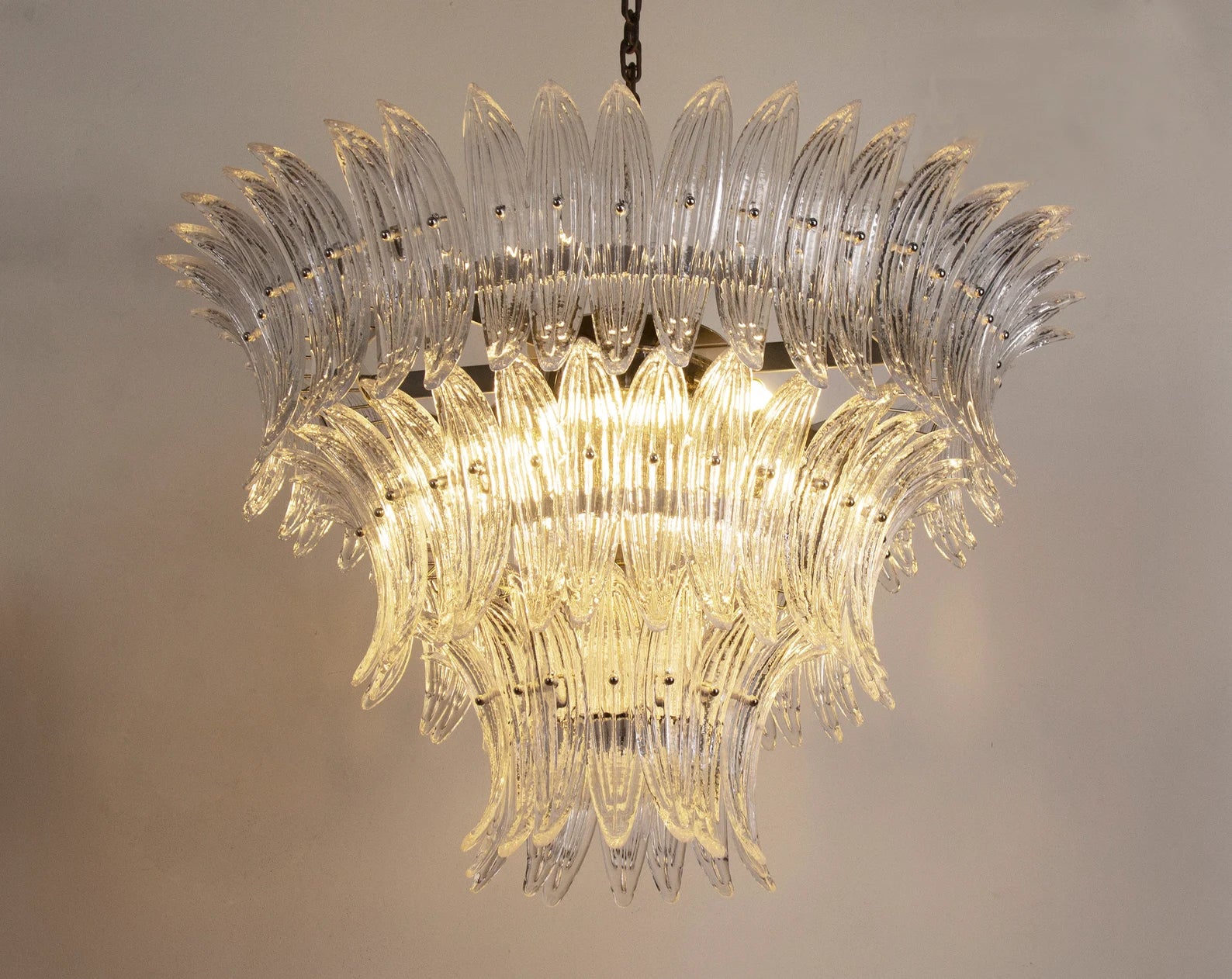 Murano Transparent Palmette Chandelier er en håndlaget italiensk lysekrone med elegante, løvformede glassblader i klart Murano-glass. Hver glassdel er munnblåst og montert for hånd, noe som skaper et harmonisk spill av lys og refleksjoner – et ikonisk uttrykk for italiensk vintage-design med moderne eleganse.
