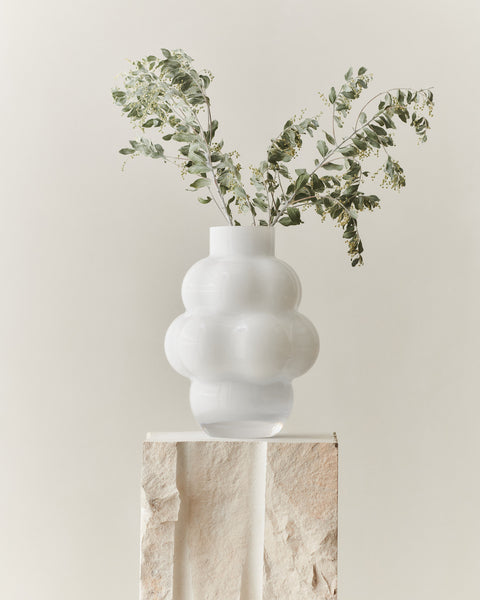 Louise Roe Balloon Vase 04 er et ikonisk designobjekt inspirert av den eldgamle Venus fra Willendorf – et symbol på styrke, femininitet og fruktbarhet. Den skulpturelle formen kombinerer mykhet og kraft, og i fargen Opal White tilfører den rommet et rolig, nesten lysende nærvær.