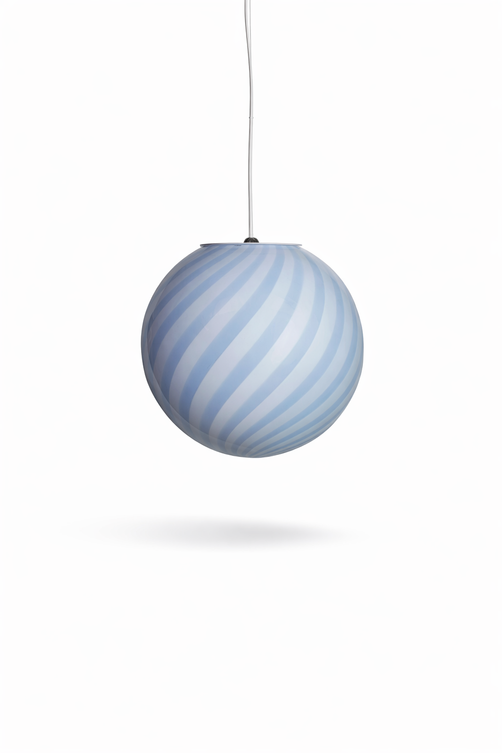 Candy Light Blue Swirl Murano Pendant Lamp – Ø20 er en håndlaget pendellampe i ekte Murano-glass, produsert av erfarne glassmestere i Venezia. Denne Murano glass pendant lampen har et elegant light blue swirl-mønster inspirert av klassiske candy stripes, som gir et mykt, luftig og stemningsfullt lys gjennom det autentiske italienske glasset.