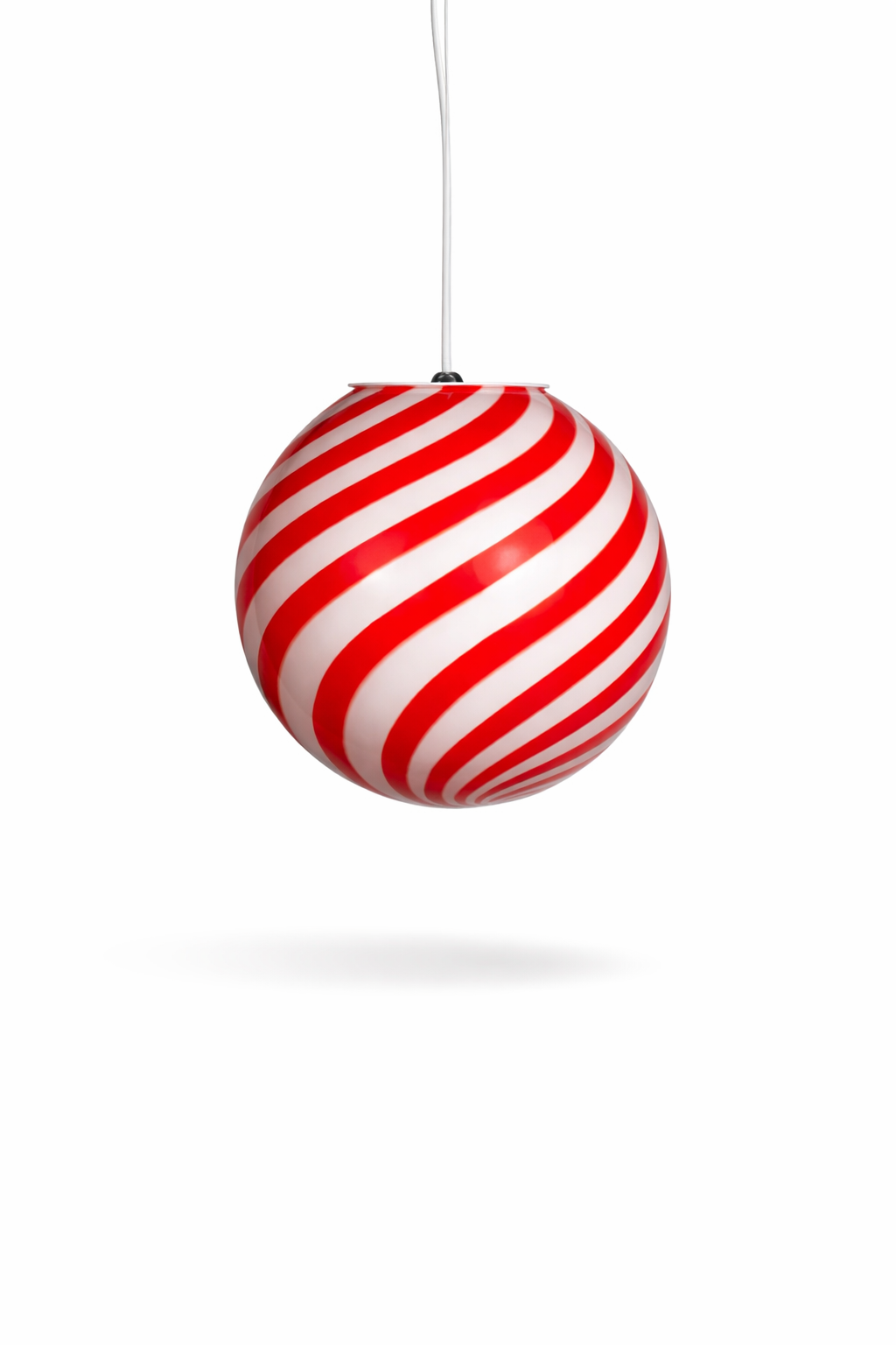 Candy Swirl Murano Pendant Lamp – Red & White Ø20 er en håndlaget pendellampe i ekte Murano-glass, produsert av erfarne glassmestere i Venezia. Denne Murano glass pendant lampen har et ikonisk red & white swirl-mønster inspirert av klassiske candy stripes, som gir et varmt, mykt og stemningsfullt lys gjennom det autentiske italienske glasset.
