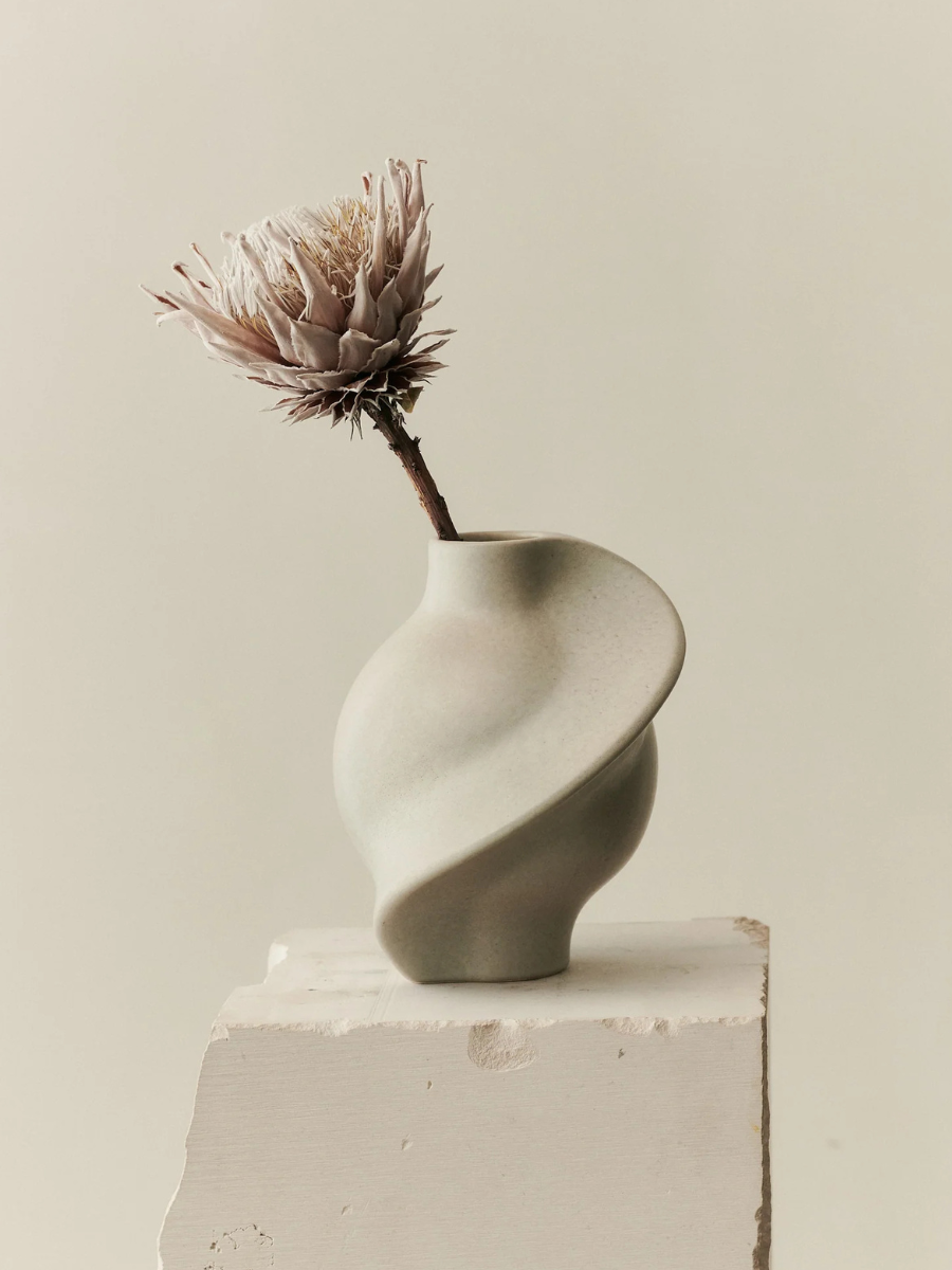 Med sine organiske linjer og grasiøse silhuett er Louise Roe Pirout Vase 01 et skulpturelt blikkfang – enten den står alene eller med en enkel sesongblomst. Formen uttrykker bevegelse og balanse, og tilfører interiøret et kunstnerisk og harmonisk preg.